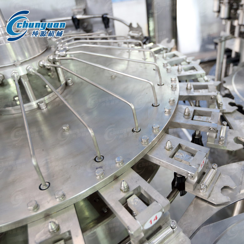紅茶飲料灌裝機(jī)洗瓶部分:全新的不銹鋼夾鉗,結(jié)構(gòu)簡(jiǎn)單,調(diào)整方便;與瓶口接觸面積少,有效避免對(duì)瓶口的二次污染。