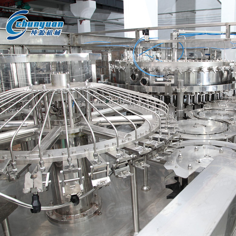 純源機械廠家供應的雪碧含汽飲料機械集沖洗、灌裝、旋蓋于一體,適用于灌裝雪碧、可樂、碳酸飲料、含汽蘇打水等含汽飲料的聚酯瓶灌裝,全過程實現(xiàn)自動化。